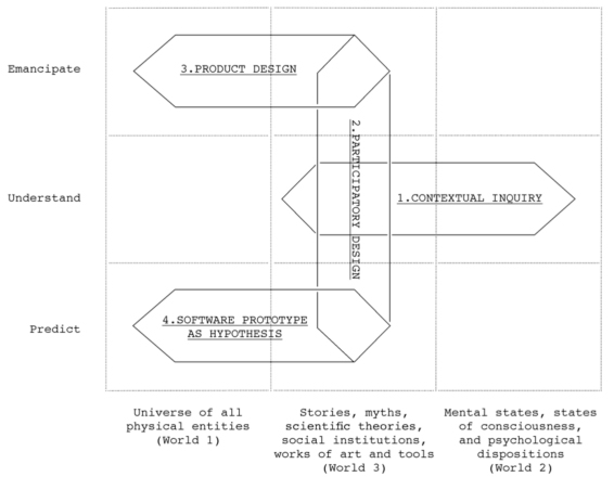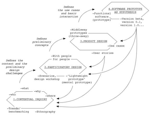 Figure 2: Research-based Design Process: Contextual Inquiry, Participatory Design, Product Design, and Production of Software as Hypothesis (Some rights reserved).