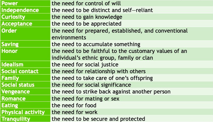 Steven Reiss (2000) has presented a theory of 16 basic desires that motivates human action. There isn’t a lot of empirical research evidence, but I see it as an interesting design framework when thinking about learning environments and universities.